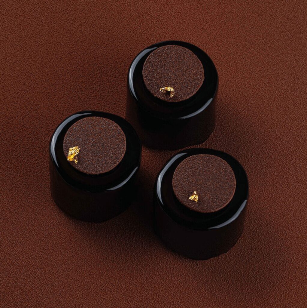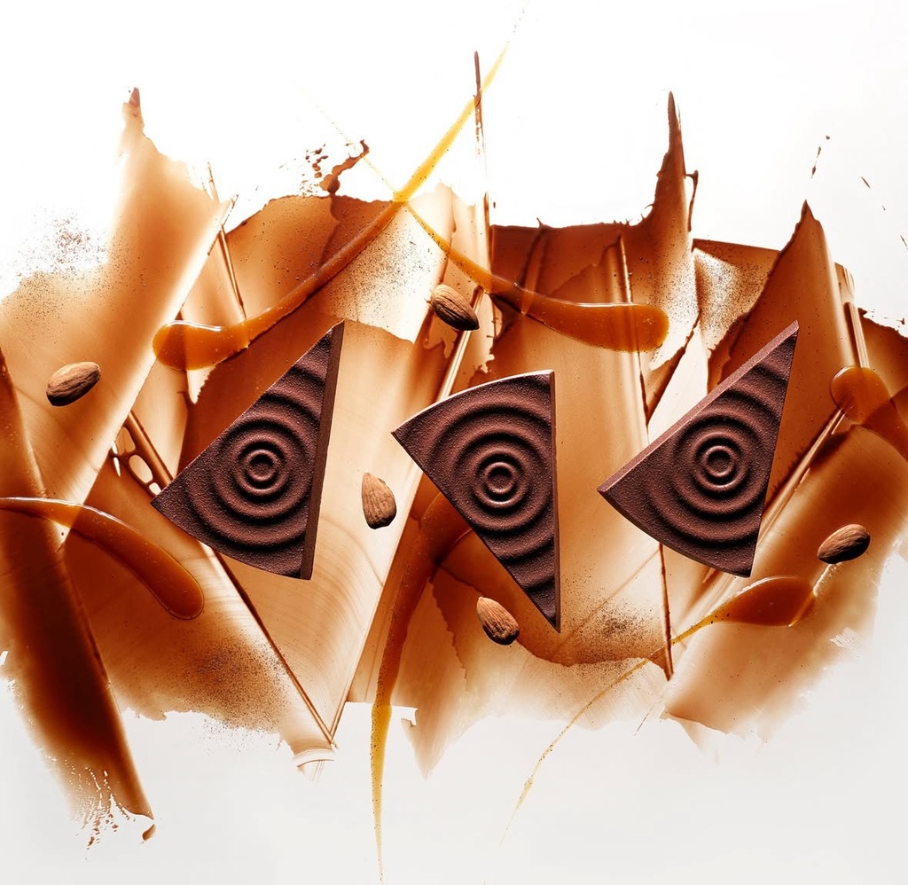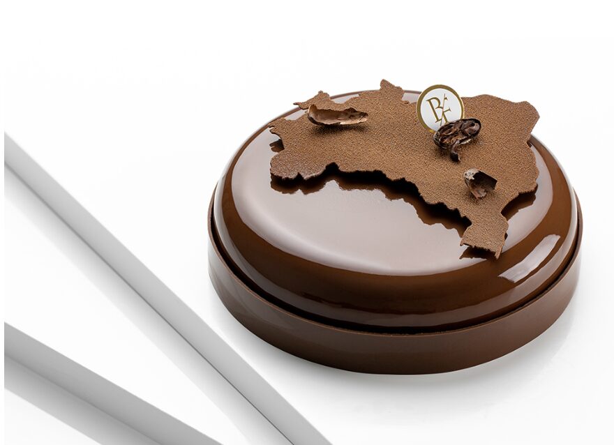 Véritable manifeste chocolaté, Onde de Choc d’Arnaud Larher joue sur la puissance et la précision. Ses lignes graphiques et ses motifs en relief rappellent la vibration du cacao, tandis que son intensité gourmande révèle toute la profondeur des fèves soigneusement travaillées. Une création contemporaine, à la fois esthétique et sensorielle, qui traduit la force vivante du chocolat.
