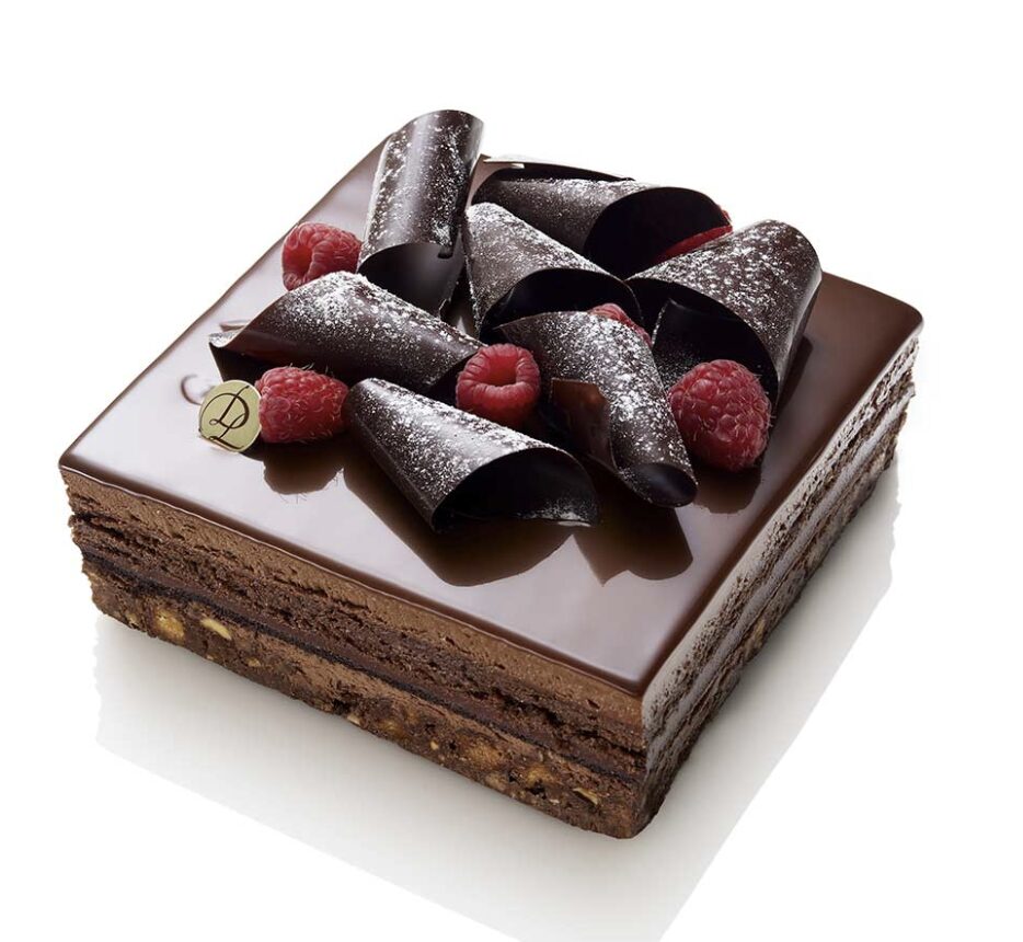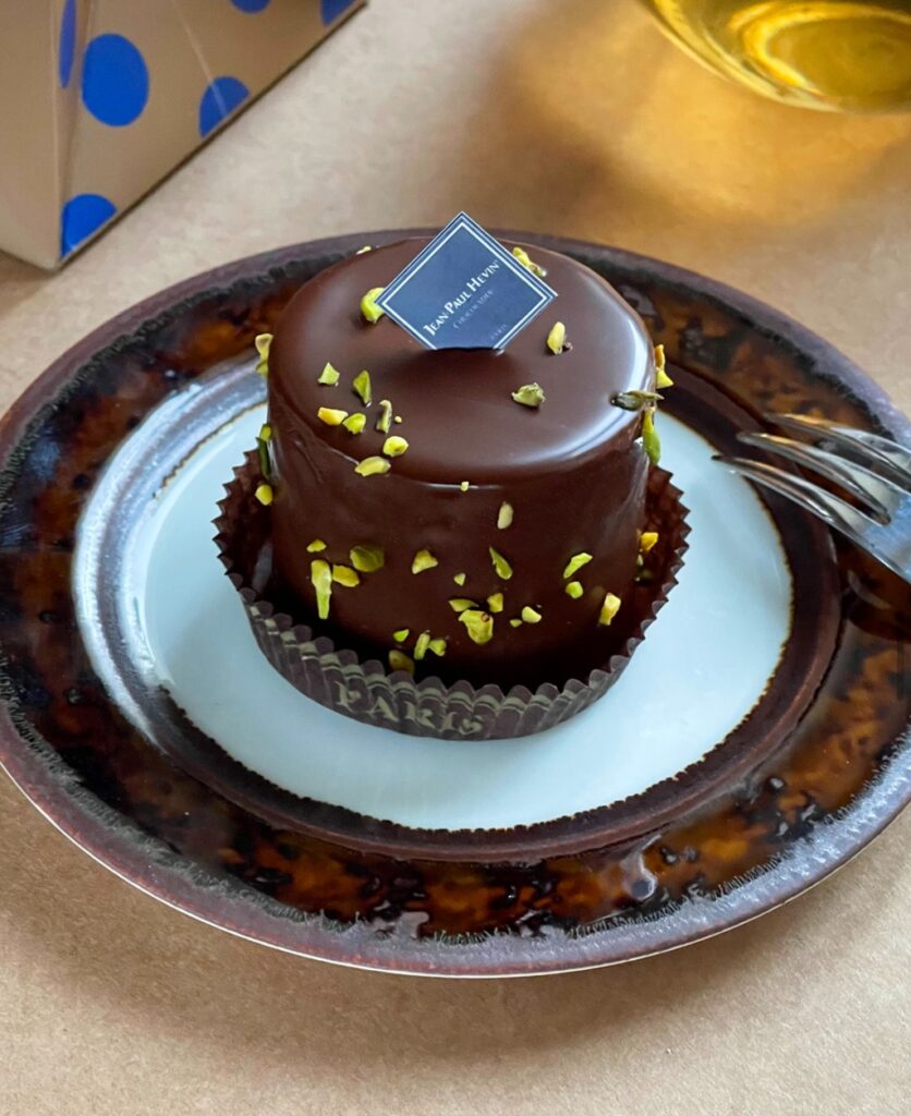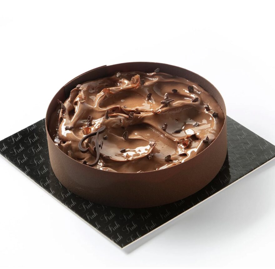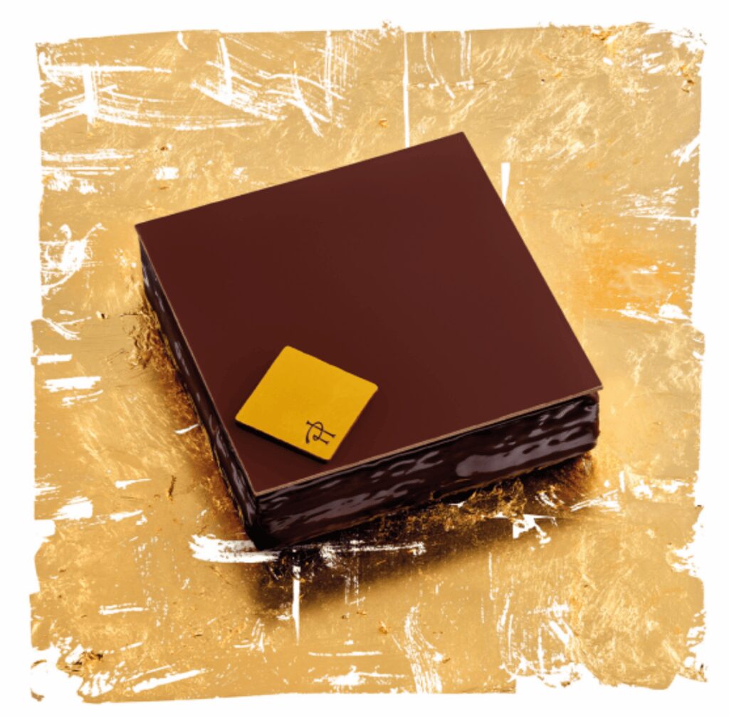 Icône gourmande de la Maison Jean-Paul Hévin, le Longchamp se décline ici en version chocolat noir. Un dessert raffiné où s’entrelacent une dacquoise aux amandes, une meringue française légère et une mousse au chocolat noir intense. Enrobé d’un glaçage brillant et parsemé d’éclats de pistache, il incarne la rencontre entre élégance pâtissière et puissance cacaotée.
