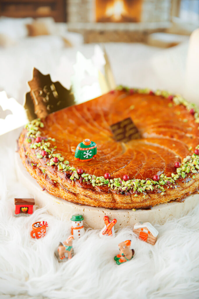 La pistache est mise à l’honneur dans la galette proposée par la Maison Guillet, tant sur le plan gustatif que visuel. Sa présence se lit dès le premier regard, avec un décor généreux et festif. En bouche, elle apporte une intensité aromatique maîtrisée, soutenue par un feuilletage croustillant et régulier. Crédit Photo : Juicy Olive