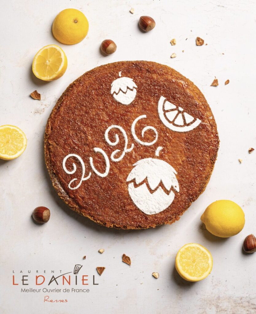 Laurent Le Daniel propose une frangipane revisitée, où la rondeur de la noisette rencontre la fraîcheur du citron. Cette alliance apporte tension et vivacité à la dégustation. Le décor épuré, marqué par des codes graphiques précis, souligne une approche contemporaine tout en respectant les fondamentaux de la galette traditionnelle. Crédit Photo : Marion Le Glouet