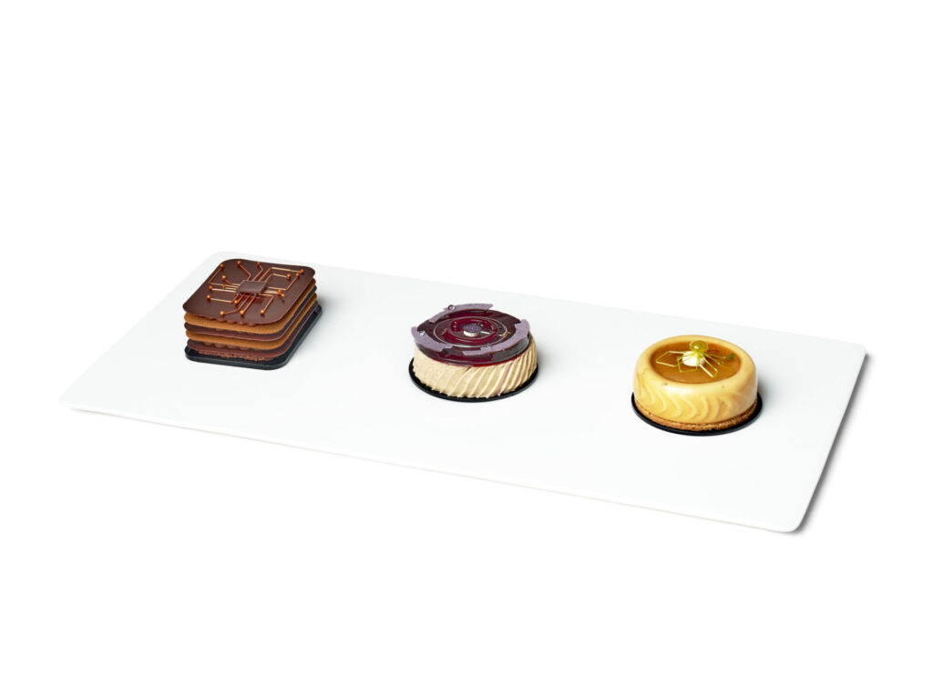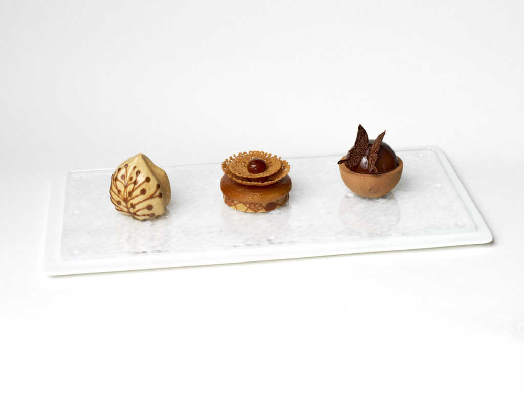 La création artistique se prolonge dans la dégustation, avec trois petits gâteaux individuels (entre 60 et 80 g), intégrés à la pièce :