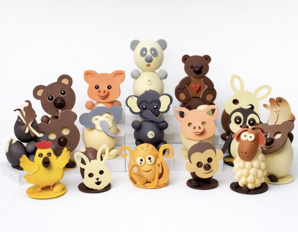 Oriol Balaguer propose de son côté une collection d’animaux stylisés, aux formes douces et aux expressions attachantes. Ours, éléphant, panda ou singe composent une galerie pleine de tendresse, où le travail précis du chocolat donne naissance à de véritables petits personnages.