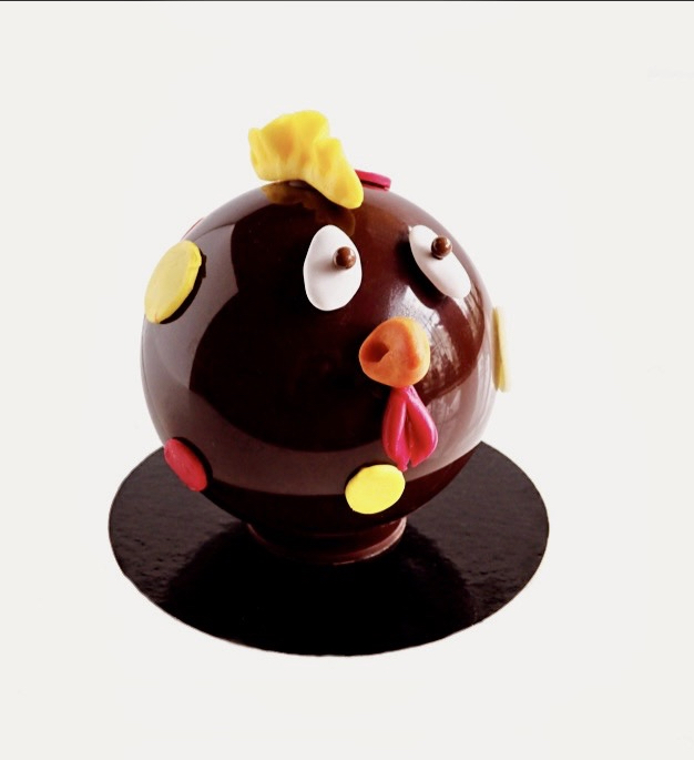 Chez Nicolas Bernardé, la poule de Pâques se présente sous une forme simple et expressive. Une sphère de chocolat ponctuée de détails colorés qui lui donnent immédiatement du caractère. Une création joyeuse, lisible et pleine de fraîcheur.