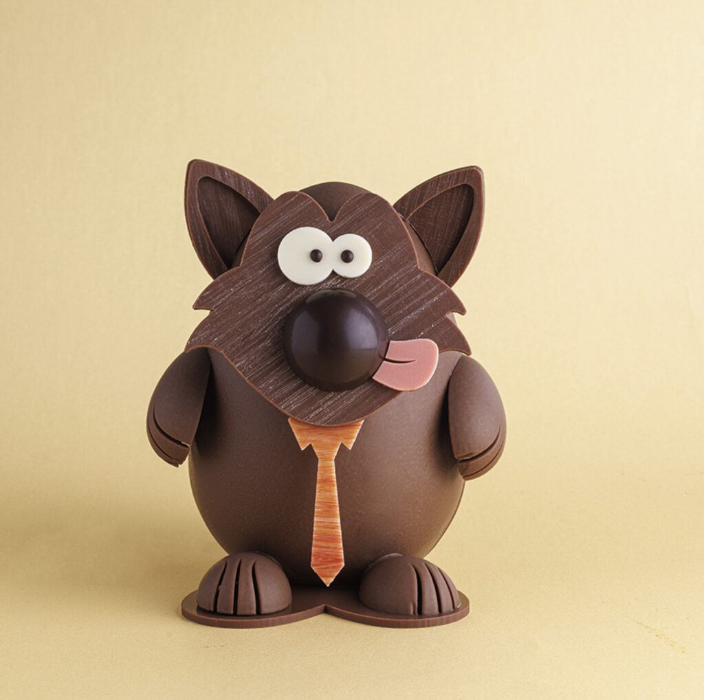 Avec son loup en chocolat, Sébastien Bouillet joue lui aussi avec l’esprit du conte. Rond, espiègle et légèrement impertinent avec sa langue tirée et sa cravate, ce personnage semble tout droit sorti d’une histoire pour enfants, revisité avec l’humour du chef.