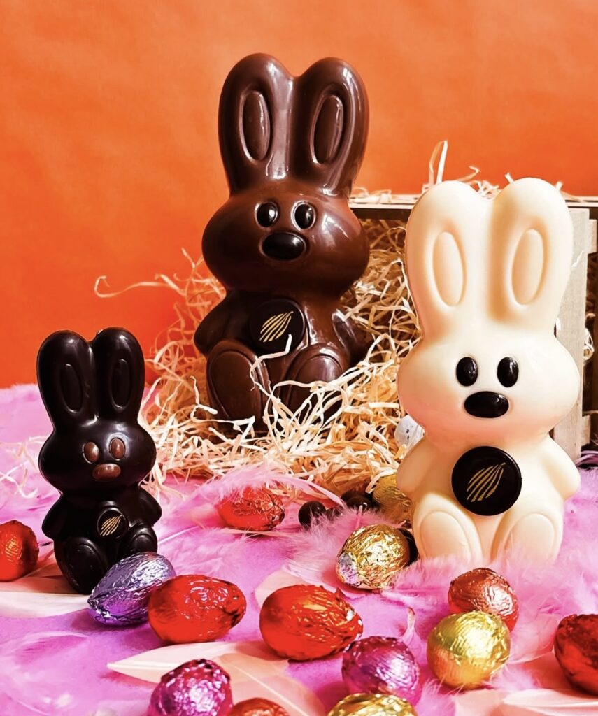 Jean-Philippe Darcis revisite quant à lui le lapin de Pâques dans une version stylisée et familiale. Déclinés en chocolat noir, lait ou blanc, ces lapins aux formes arrondies et aux expressions simples évoquent immédiatement la tradition de la chasse aux oeufs.