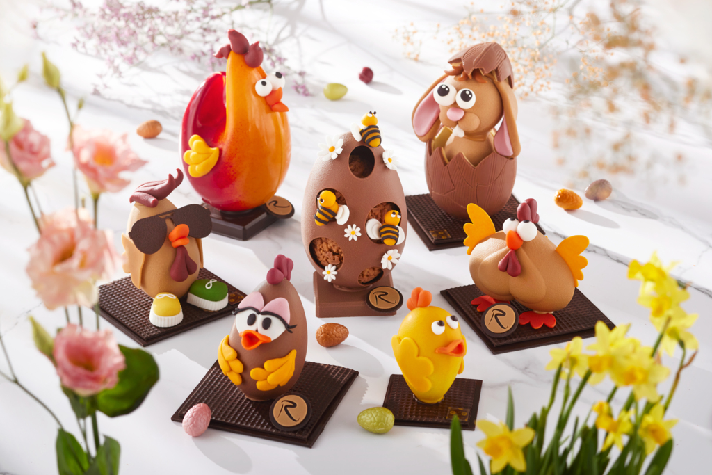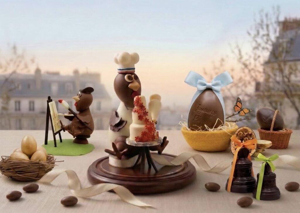 Avec sa collection « Pâques à la française », Aurélien Trottier célèbre quant à lui l’artisanat et les passions qui font la richesse de notre culture. Poule pâtissière, poule peintre ou coq sportif sont entièrement façonnés à la main dans un chocolat d’exception. Chaque pièce reflète le goût du détail et le plaisir du geste artisanal.
