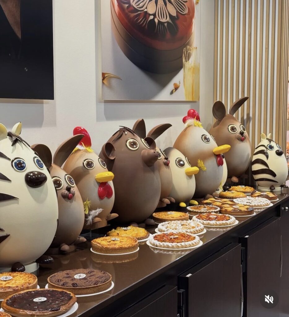 Dans la vitrine de Marc Ducobu, une grande famille de créatures en chocolat se rassemble pour célébrer Pâques. Poules, lapins ou zèbres affichent des silhouettes généreuses et des regards expressifs. Une collection gourmande et pleine d’humour qui attire immédiatement le regard.