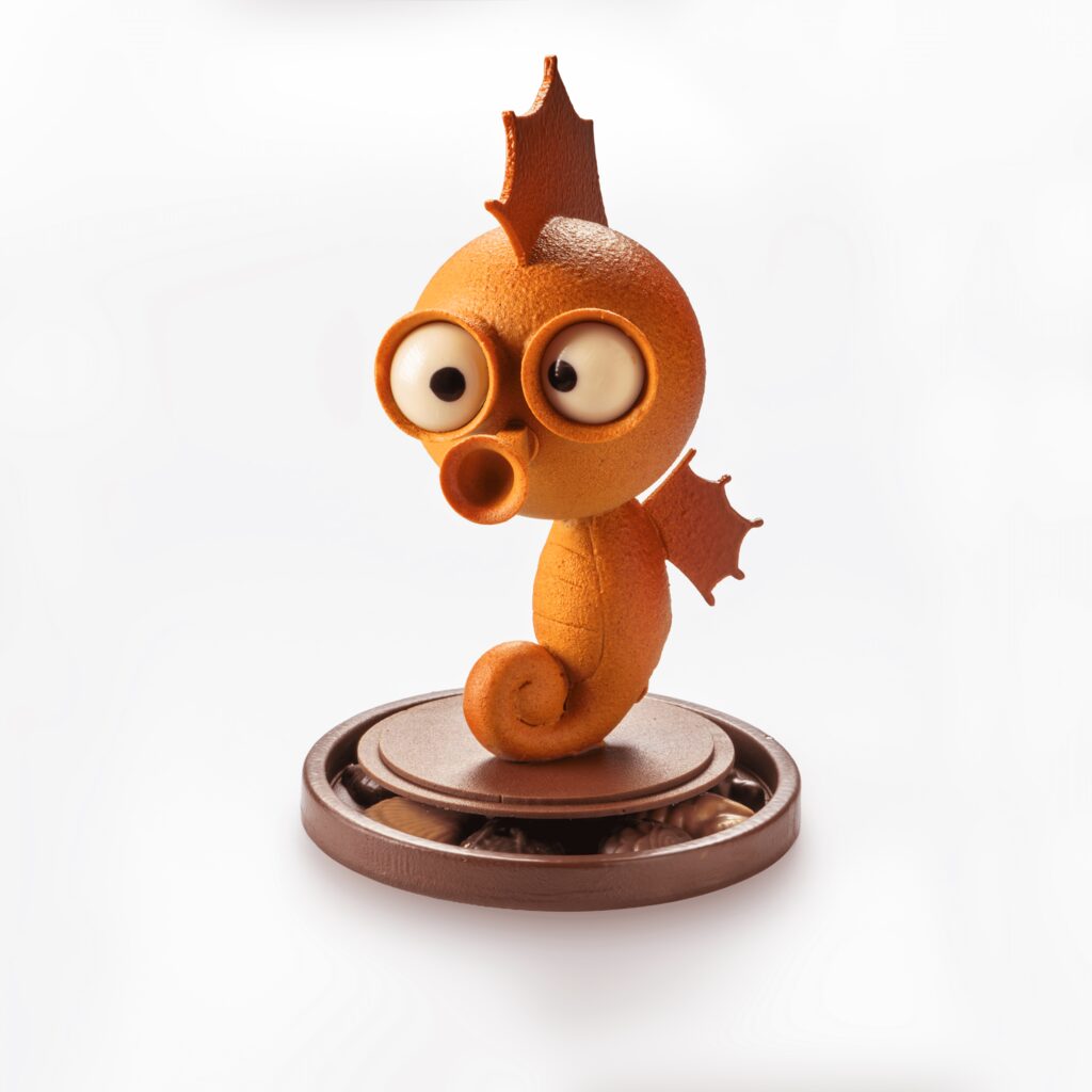 Chez Vincent Guerlais, l’aventure commence au fond des océans. Avec Antoine l’Hippocampe, le chocolatier imagine une pièce élégante et pleine de détails. La silhouette fine de cet hippocampe révèle un travail précis du chocolat au lait et du chocolat blanc caramélisé. Sous cette allure délicate se cache un assortiment de fritures de Pâques qui prolonge la surprise et invite à la découverte.