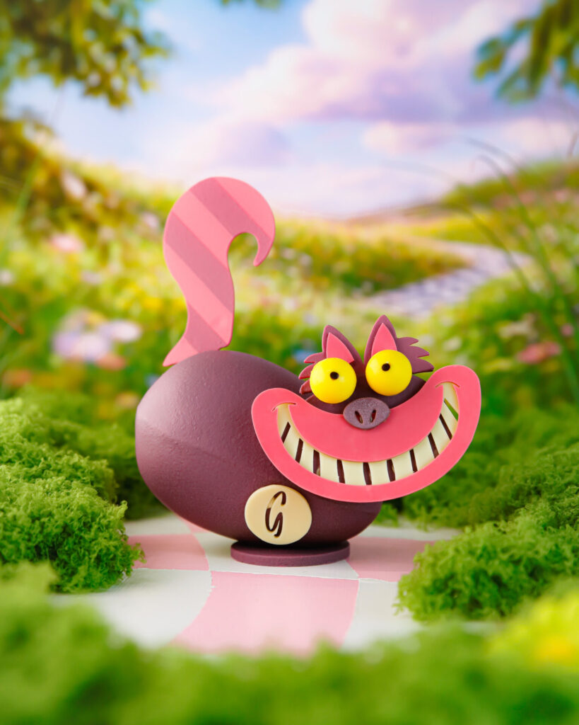 La Maison Guillet, elle, entraîne les gourmands dans l’univers fantasque d’Alice au Pays des Merveilles. Avec son large sourire et ses yeux malicieux, le Chat Cheshire surgit comme un personnage de conte. Une création colorée et expressive qui rappelle que Pâques est aussi un moment de jeu et d’imaginaire.