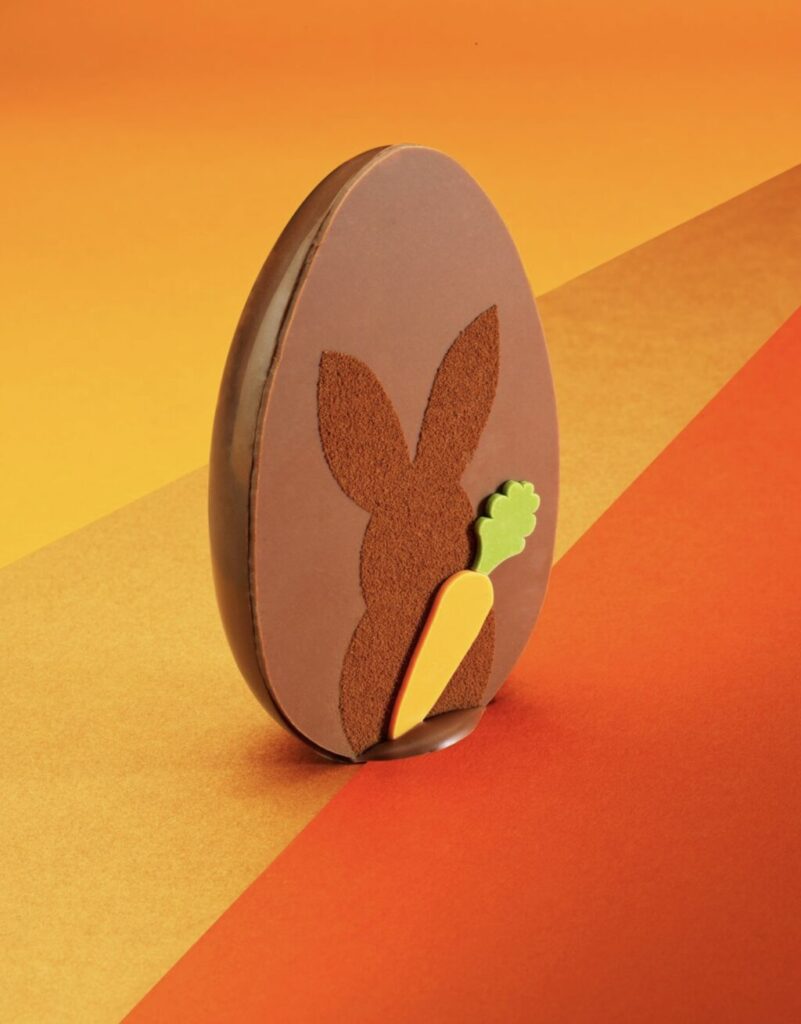 Avec sa création Pascalou, Jean-Paul Hévin propose enfin un oeuf graphique où l’ombre d’un lapin se dessine en relief, accompagnée d’une carotte colorée. Une pièce épurée qui joue sur la silhouette et le contraste pour évoquer la figure emblématique de Pâques avec beaucoup de finesse.