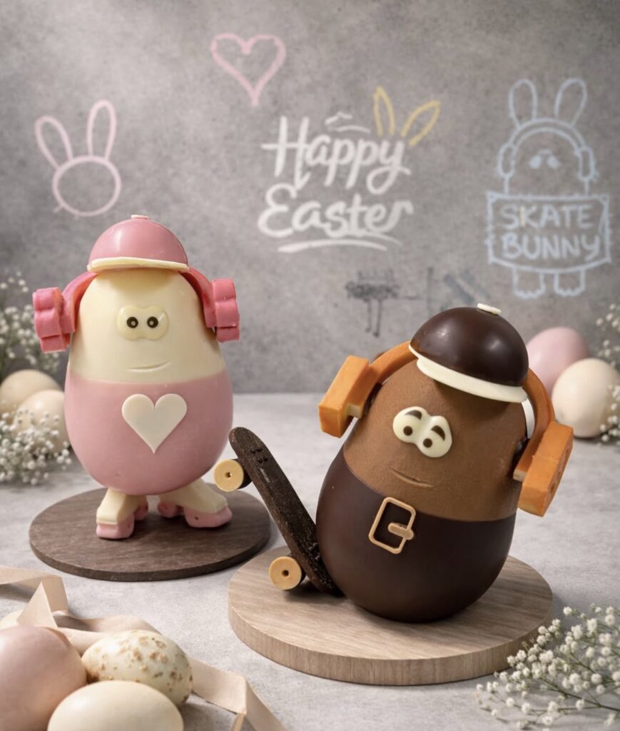 Chez la Maison Matyasy, Pâques adopte une touche résolument contemporaine. Les oeufs se transforment en personnages modernes, casque audio sur les oreilles ou skateboard à la main. Une vision amusante et graphique qui revisite les codes traditionnels de la fête avec un regard actuel.
