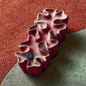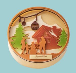 Cette bûche rend hommage à la passion de la famille Sève pour les voyages et aux souvenirs que l’on rapporte des lieux traversés, comme ces magnets collectés et collés dans la cuisine au fil des années, témoins de leurs destinations favorites. Son décor graphique s’inspire de formes presque baroques, de feuilles et de fleurs, sculptées.