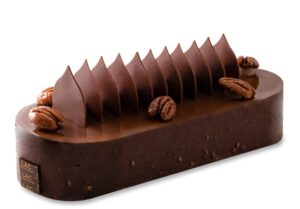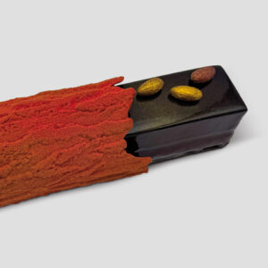 Incontournable alliance, Pierre Hermé accorde la pistache dans une bûche au chocolat Noir Pure Origine Bélize, District de Cayo, Plantation Xibun. Le chocolat se dévoile sans détour, la pistache quant à elle se révèle en “deuxième acte” dans un praliné Infiniment Pistache dont la touche de fleur de sel réhausse les saveurs. Chocolat Noir Pure Origine Bélize, District de Cayo, Plantation Xibun, 64% de cacao & Infiniment Pistache
