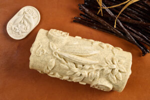 À la dégustation, elle dévoile un croustillant à la vanille, un biscuit moelleux, un gel vif et des crèmes onctueuses. Chaque bouchée révèle la richesse des plus belles vanilles du monde : Bourbon de Madagascar, Tahitensis de Papouasie-Nouvelle- Guinée, et la très rare vanille d’Équateur. Une bûche à la fois raffinée et évocatrice, qui invite à voyager par les sens.