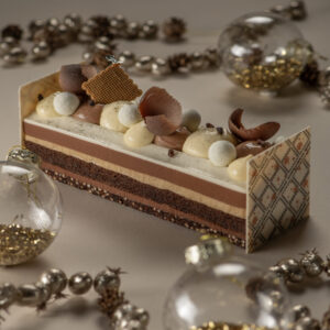 Un jeu de textures et de saveurs intenses : croustillant au grué de cacao et quinoa soufflé, biscuit chocolat moelleux, crémeux vanille infusé au grué et mousse chocolat à la fleur de sel. Le décor marie la délicatesse du crémeux vanille et la profondeur du crémeux chocolat, pour une bûche à la fois puissante et raffinée.